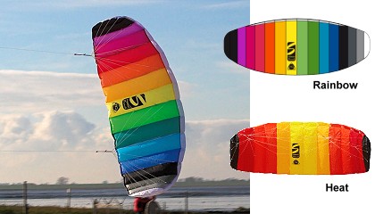 1.3 - $29.95, 1.7 - $49.95 & 2.1 $67.95 Rip-Stop Nylon. From HQ, the Symphony Beach is a basic 2-Line ram-air stunt kite. Easy handling and great performance provide worry free fun for the beginner. The 1.3 has a 51" wingspan, the 1.7 has a 65" wingspan and the 2.1 has an 81" wingspan. All kites come complete with Dyneema Flying Line and Flight Straps. Great entry level 'foil kite. Packs into 8"x8"x3" carry-case. Beginner to Expert 2-Line Power Stunt. Wind range 5-28mph. |